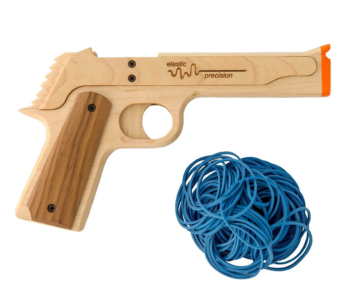 Made of maple & walnut hardwoods, this classic kid’s toy is modeled after a Springfield 1911 series handgun—like the ones made famous in early mobster movies. But instead of slugs, this one shoots rubber bands. Easy to load & shoot, it fires up to 6 at-a-time, blasting them up to 20-feet in a straight line.